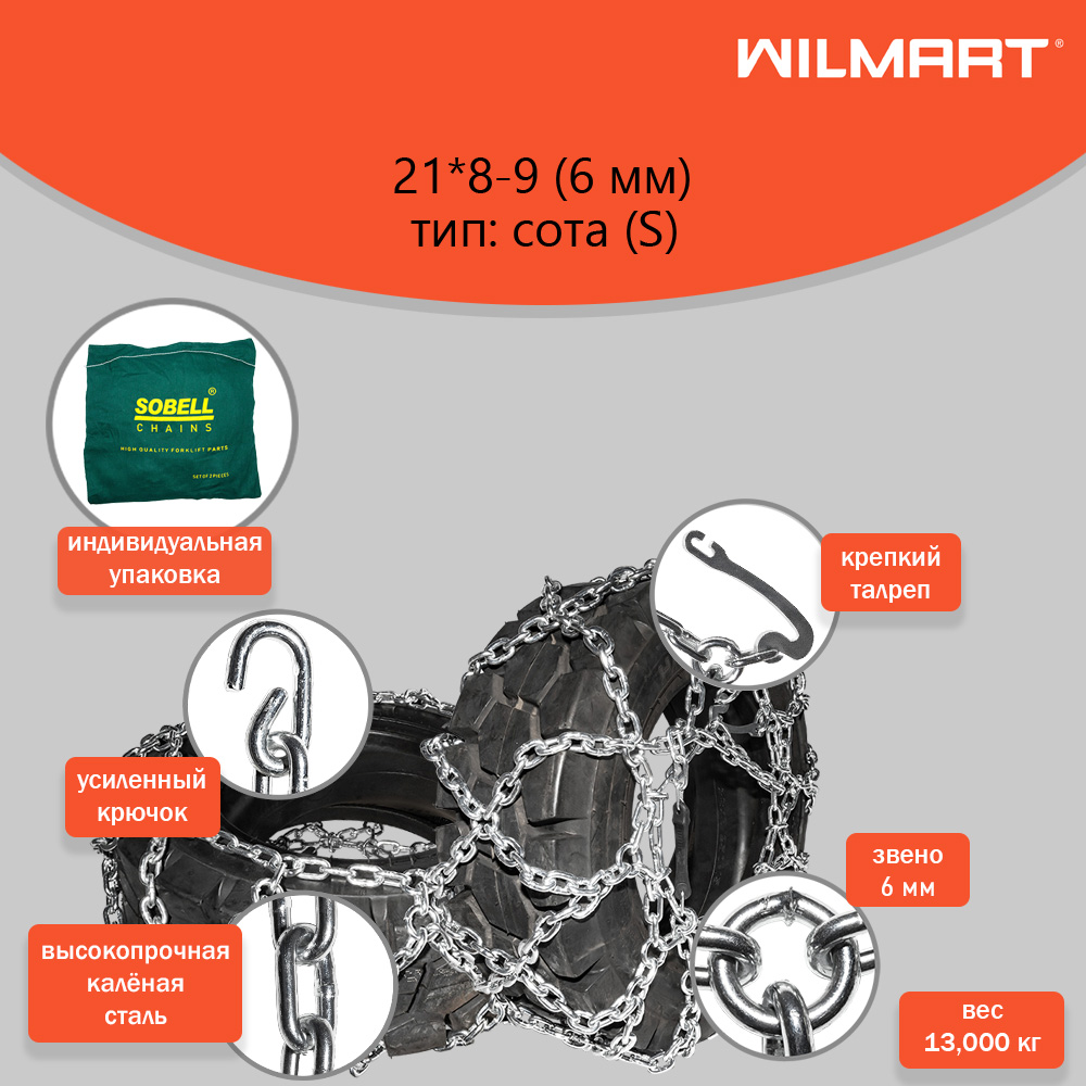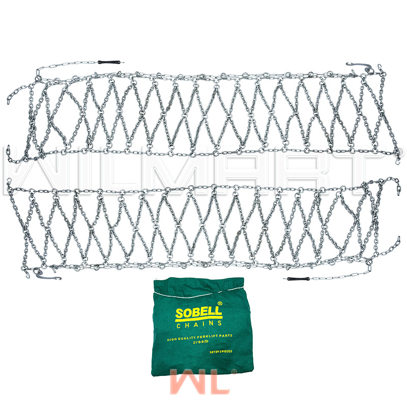 Цепь противоскольжения 21х8-9 (6мм) "Сота" для вилочного погрузчика (комплект 2 шт) SOBELL для погрузчика Balkancar BAOLI Bobcat Caterpillar Crown Daewoo Dalian Doosan Feeler Goodsense HANGCHA Heli Hyster Hyundai Jac Jungheinrich Komatsu Maximal Mitsubishi Nichiyu Nissan Still TCM TEU Toyota VP WL Yale. Конструкция жесткая, материал сталь, рисунок Сота, диаметр шины 9, размер 21х8-9, ширина профиля