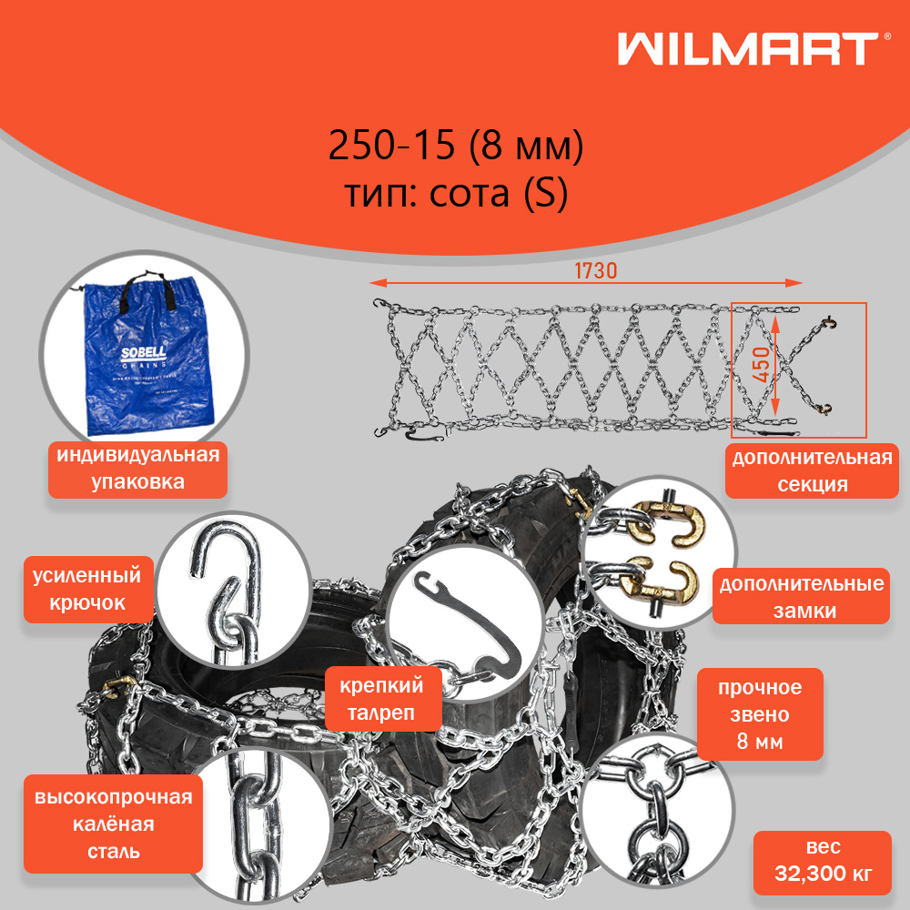 Цепь противоскольжения 250-15(8мм) "Сота" для вилочного погрузчика (комплект 2 шт) для погрузчика SOBELL